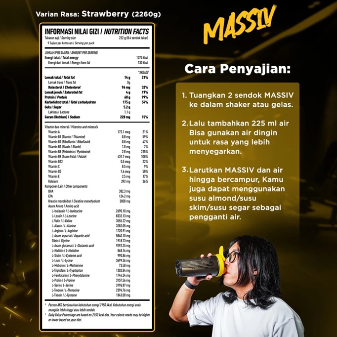 Produk Massiv juga memiliki mikro nutrisi sebanyak 10 multivitamin dan mineral yang semuanya memiliki hasil tes lab.